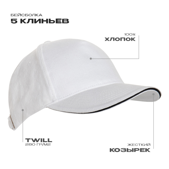 | Бейсболка с кантом STAN 5 клиньев хлопок 280, 11K, Белый | 56-58 |