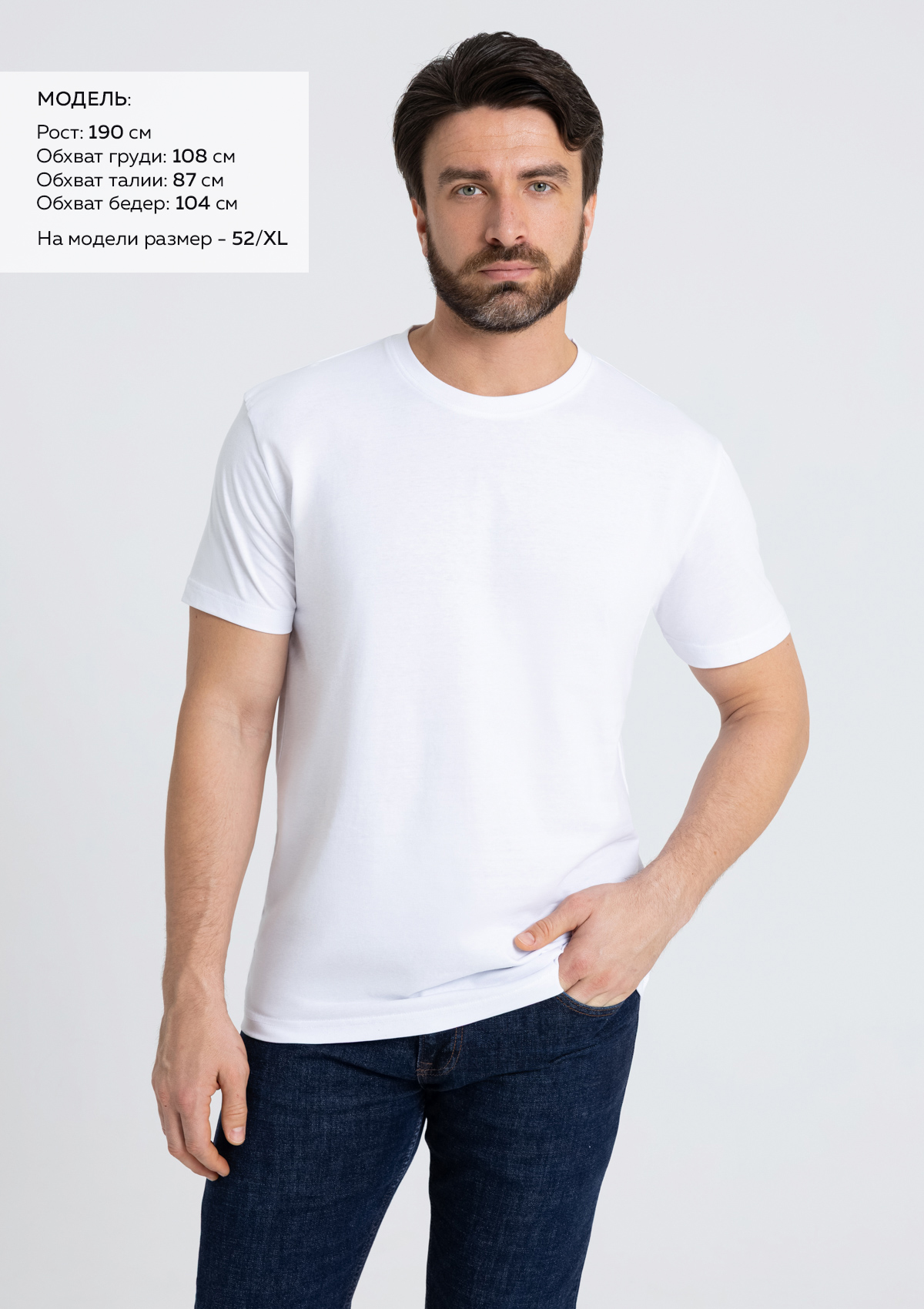 Размер мужской футболки: 52/XL. Параметры модели: рост 190 см.; обхват груди 108 см.; обхват талии 87 см.; обхват бедер 104 см.