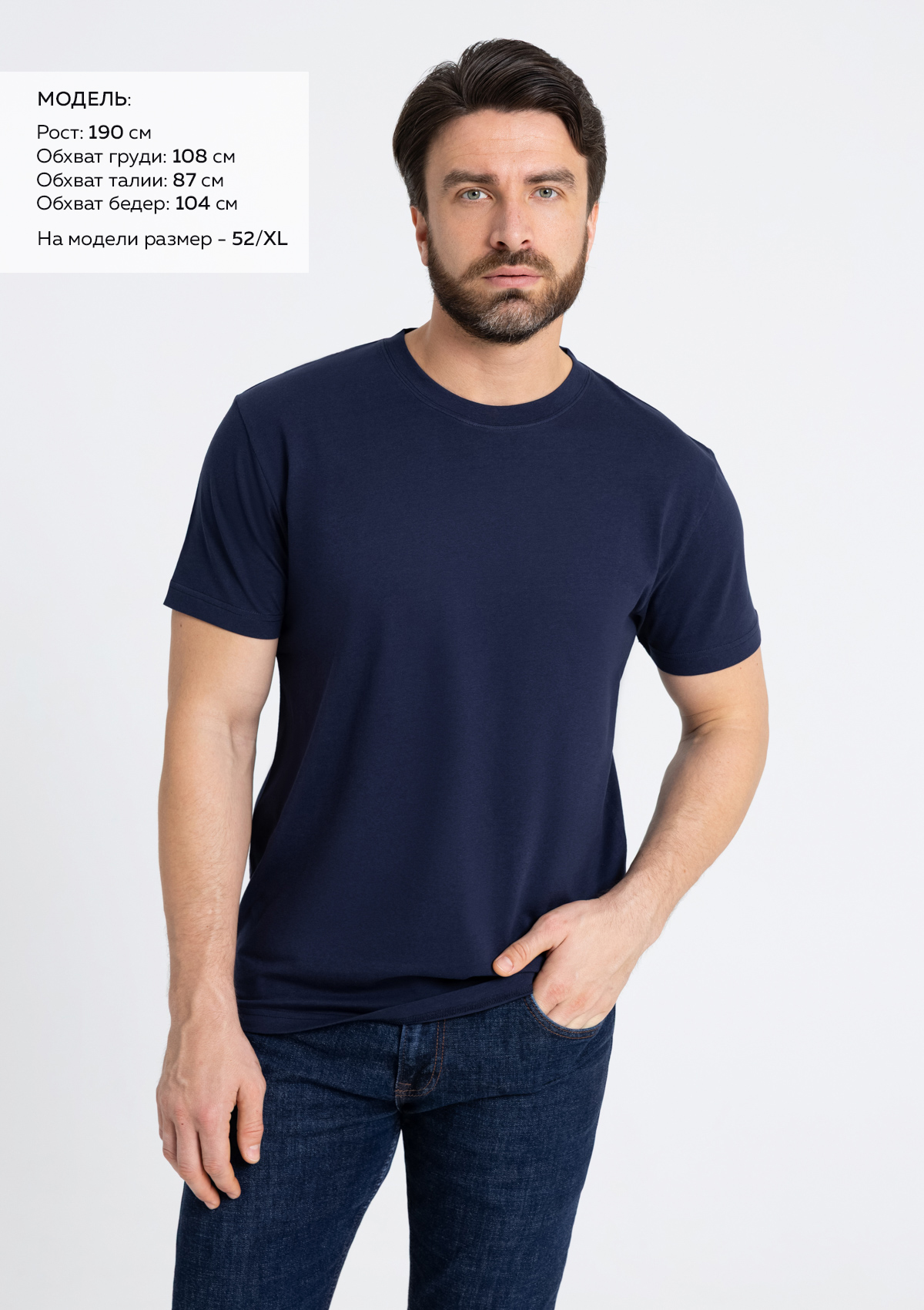 Размер мужской футболки: 52/XL. Параметры модели: рост 190 см.; обхват груди 108 см.; обхват талии 87 см.; обхват бедер 104 см.