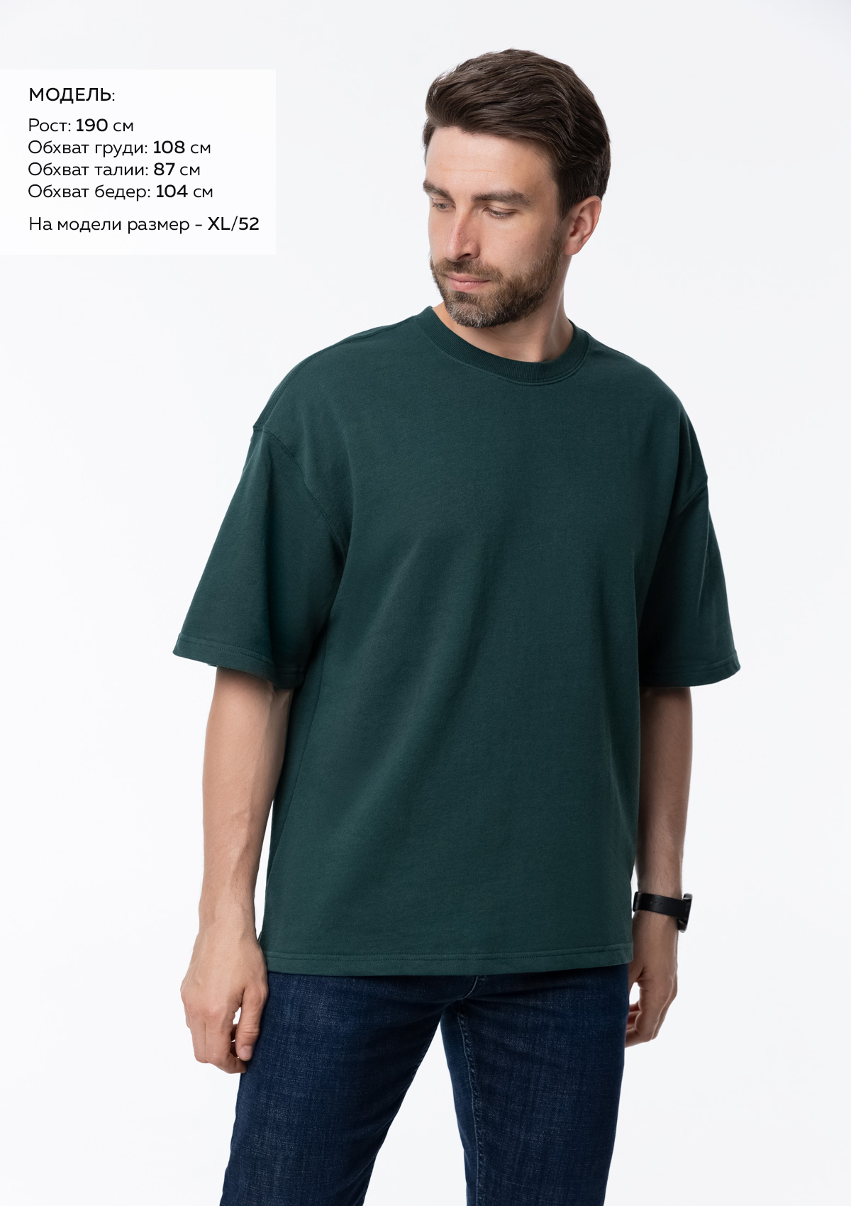 Размер мужской футболки: XL/52. Параметры модели: рост 190 см.; обхват груди 108 см.; обхват талии 87 см.; обхват бедер 104 см.