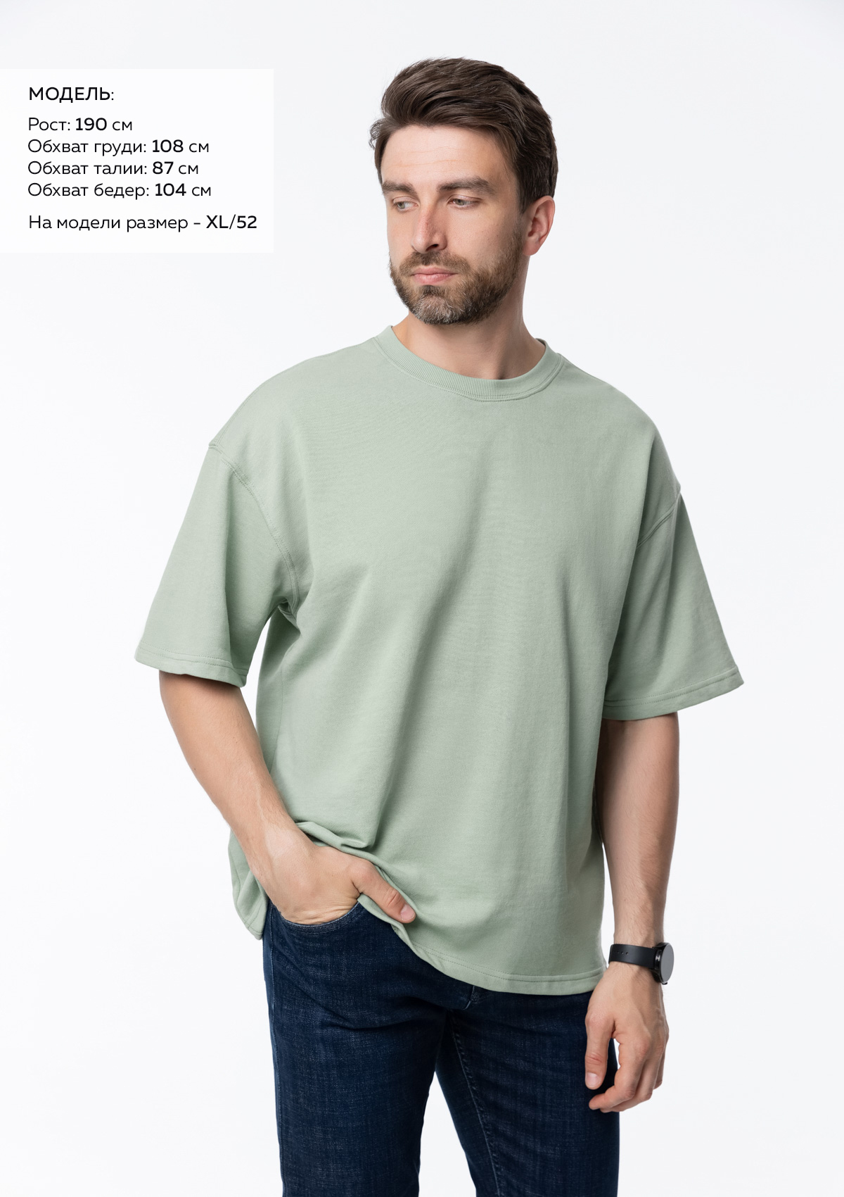Размер мужской футболки: XL/52. Параметры модели: рост 190 см.; обхват груди 108 см.; обхват талии 87 см.; обхват бедер 104 см.