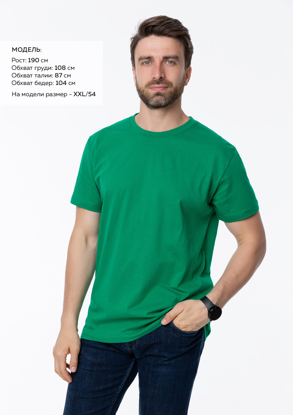 * Размер мужской футболки: XXL/54. Параметры модели: рост 190 см.; обхват груди 108 см.; обхват талии 87 см.; обхват бедер 104 см.