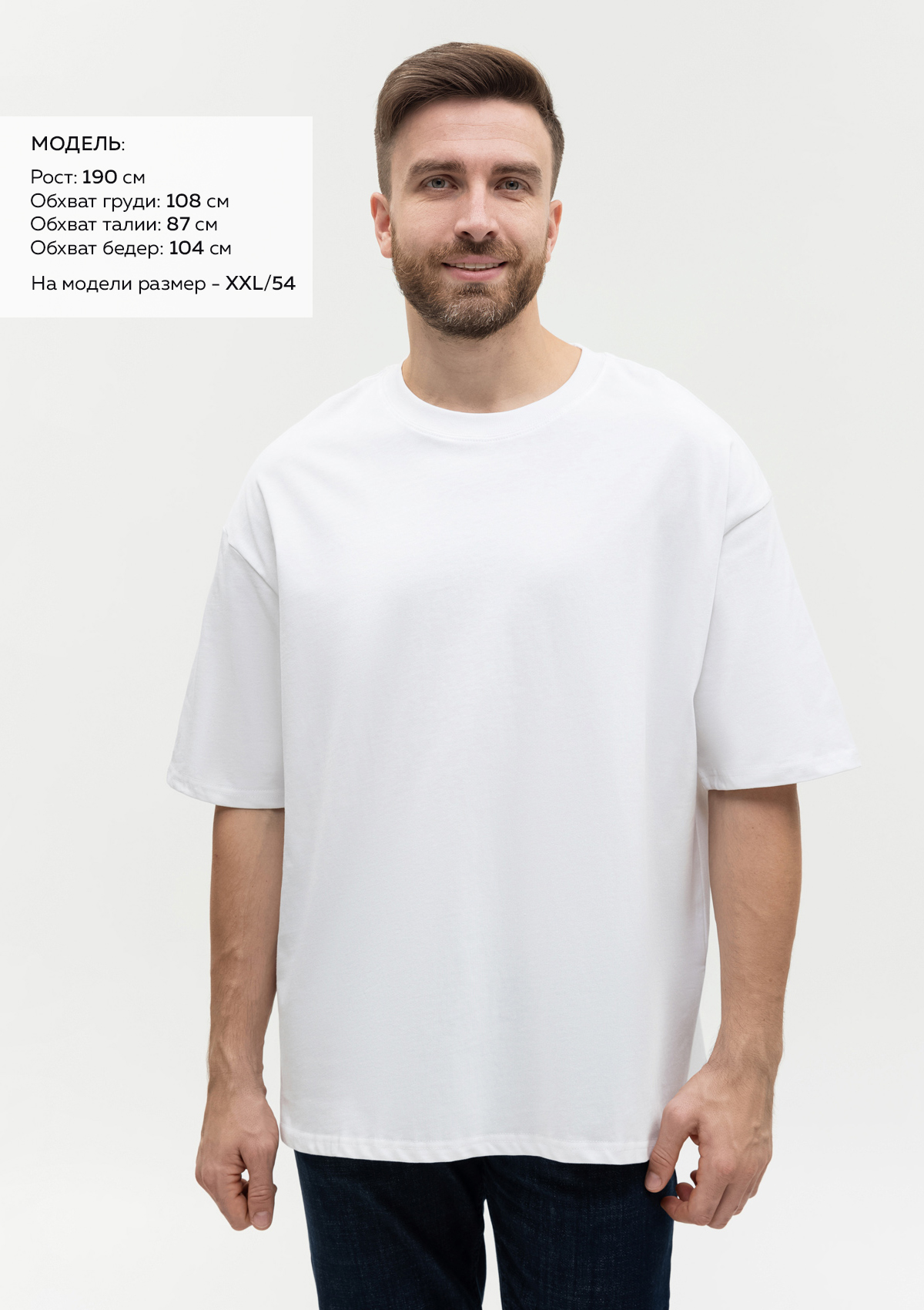 Размер мужской футболки: XXL/54. Параметры модели: рост 190 см.; обхват груди 108 см.; обхват талии 87 см.; обхват бедер 104 см.