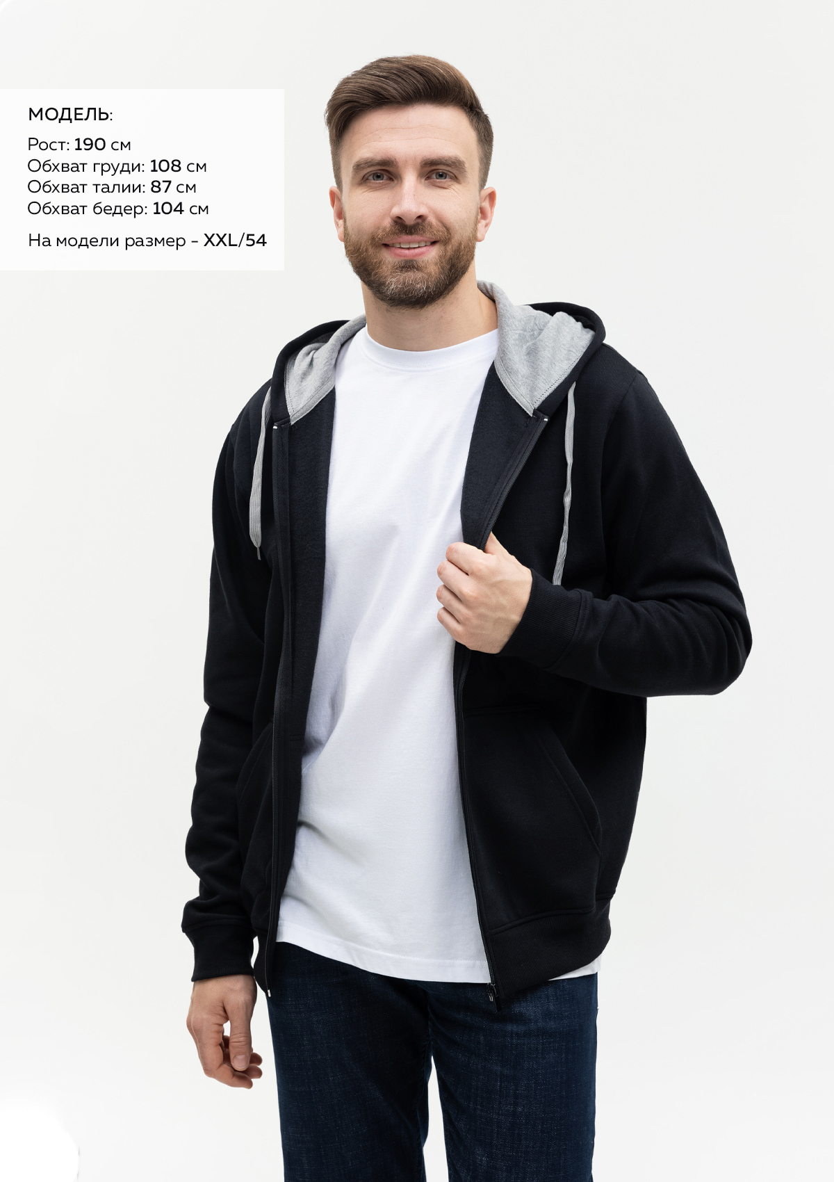 Размер мужской толстовки: XXL/54. Параметры модели: рост 190 см.; обхват груди 108 см.; обхват талии 87 см.; обхват бедер 104 см.