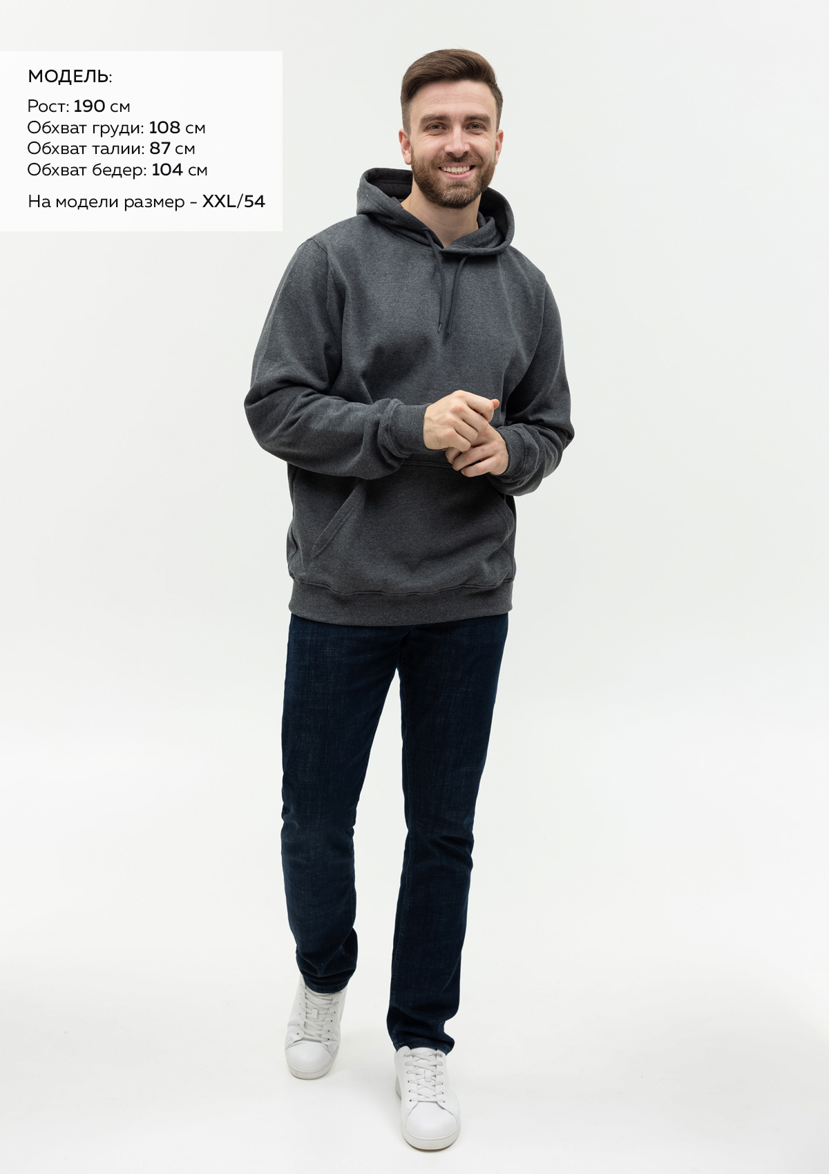 Размер мужского худи: XXL/54. Параметры модели: рост 190 см.; обхват груди 108 см.; обхват талии 87 см.; обхват бедер 104 см.