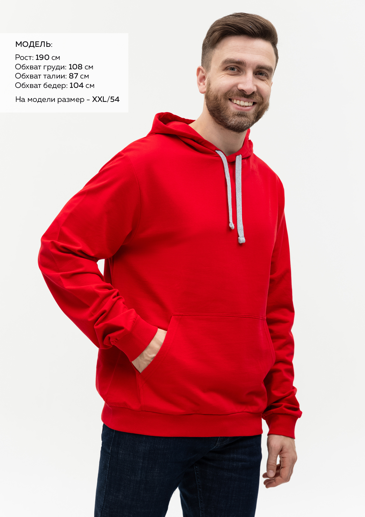 Размер мужского худи: XXL/54. Параметры модели: рост 190 см.; обхват груди 108 см.; обхват талии 87 см.; обхват бедер 104 см.