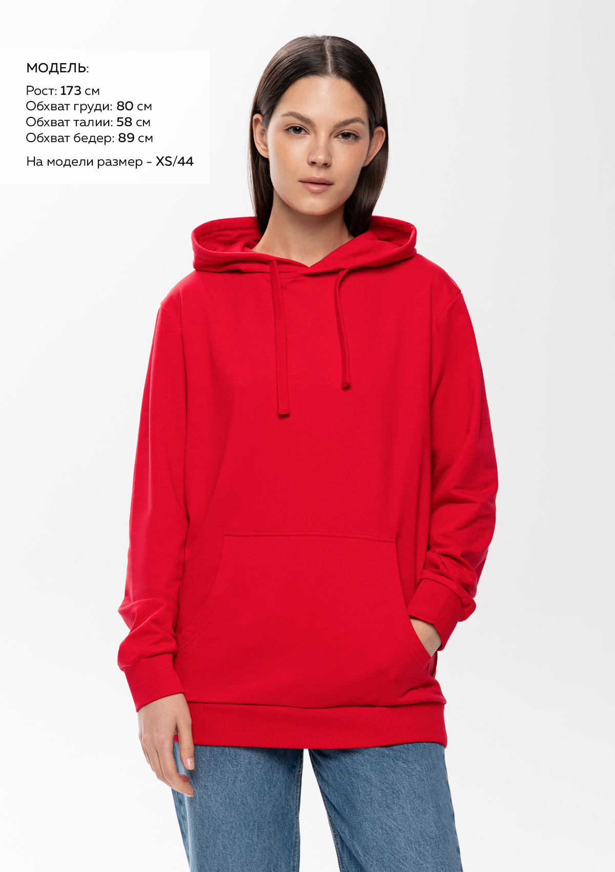 Размер женского худи: XS/44. Параметры модели: рост 173 см.; обхват груди 80 см.; обхват талии 58 см.; обхват бедер 89 см.