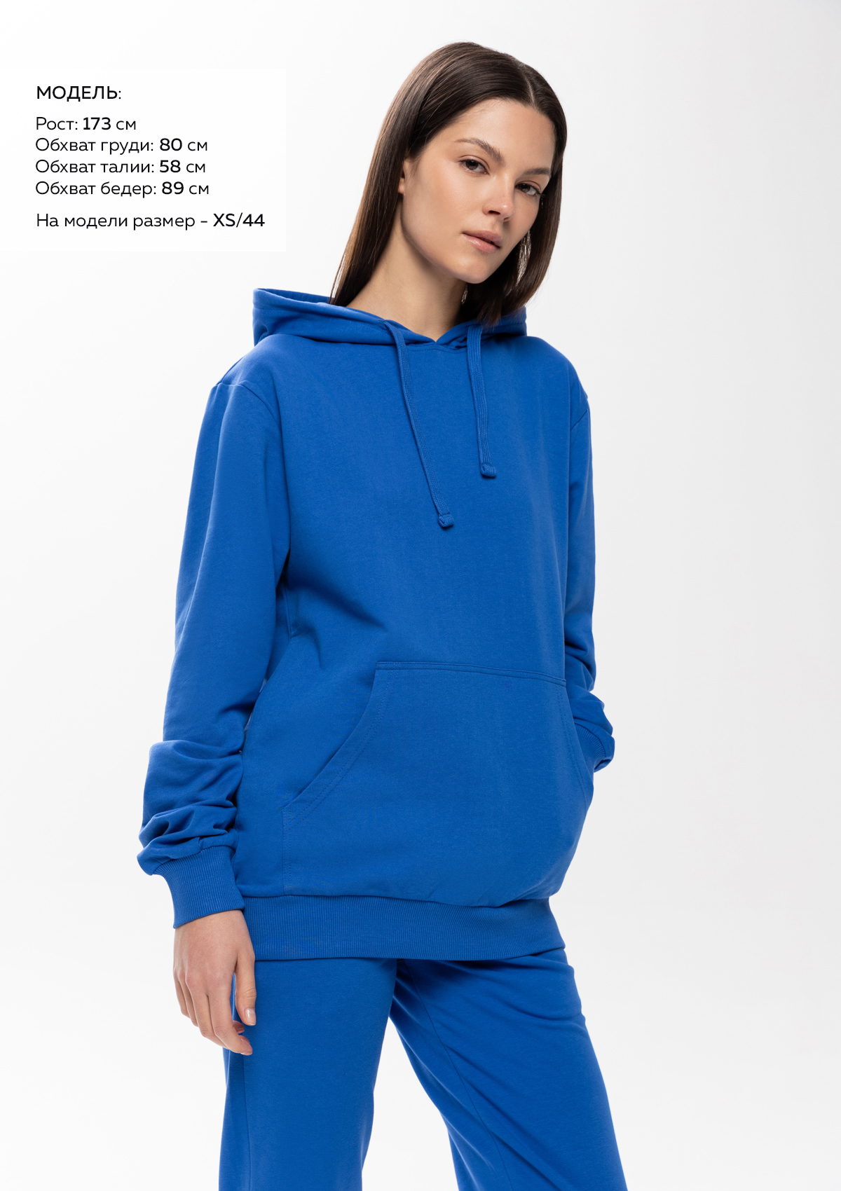 Размер женского худи: XS/44. Параметры модели: рост 173 см.; обхват груди 80 см.; обхват талии 58 см.; обхват бедер 89 см.