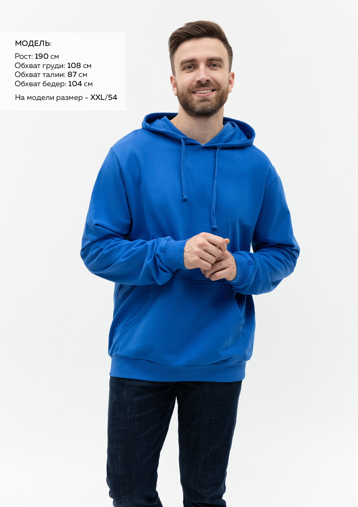 Размер мужского худи: XXL/54. Параметры модели: рост 190 см.; обхват груди 108 см.; обхват талии 87 см.; обхват бедер 104 см.