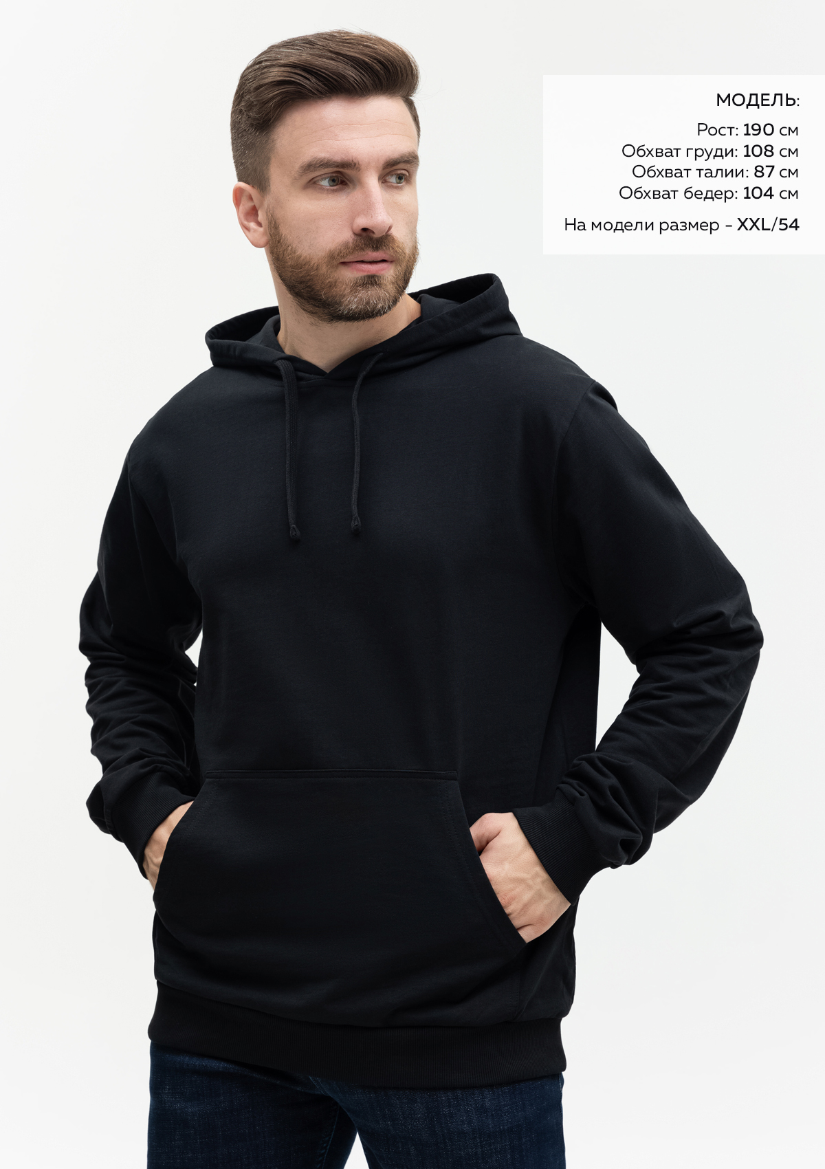 Размер мужского худи: XXL/54. Параметры модели: рост 190 см.; обхват груди 108 см.; обхват талии 87 см.; обхват бедер 104 см.