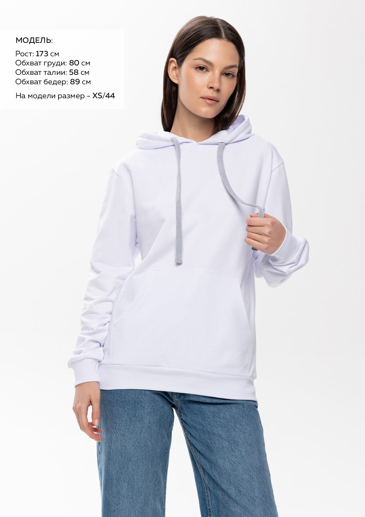 Размер женского худи: XXS/42. Параметры модели: рост 173 см.; обхват груди 80 см.; обхват талии 58 см.; обхват бедер 89 см.