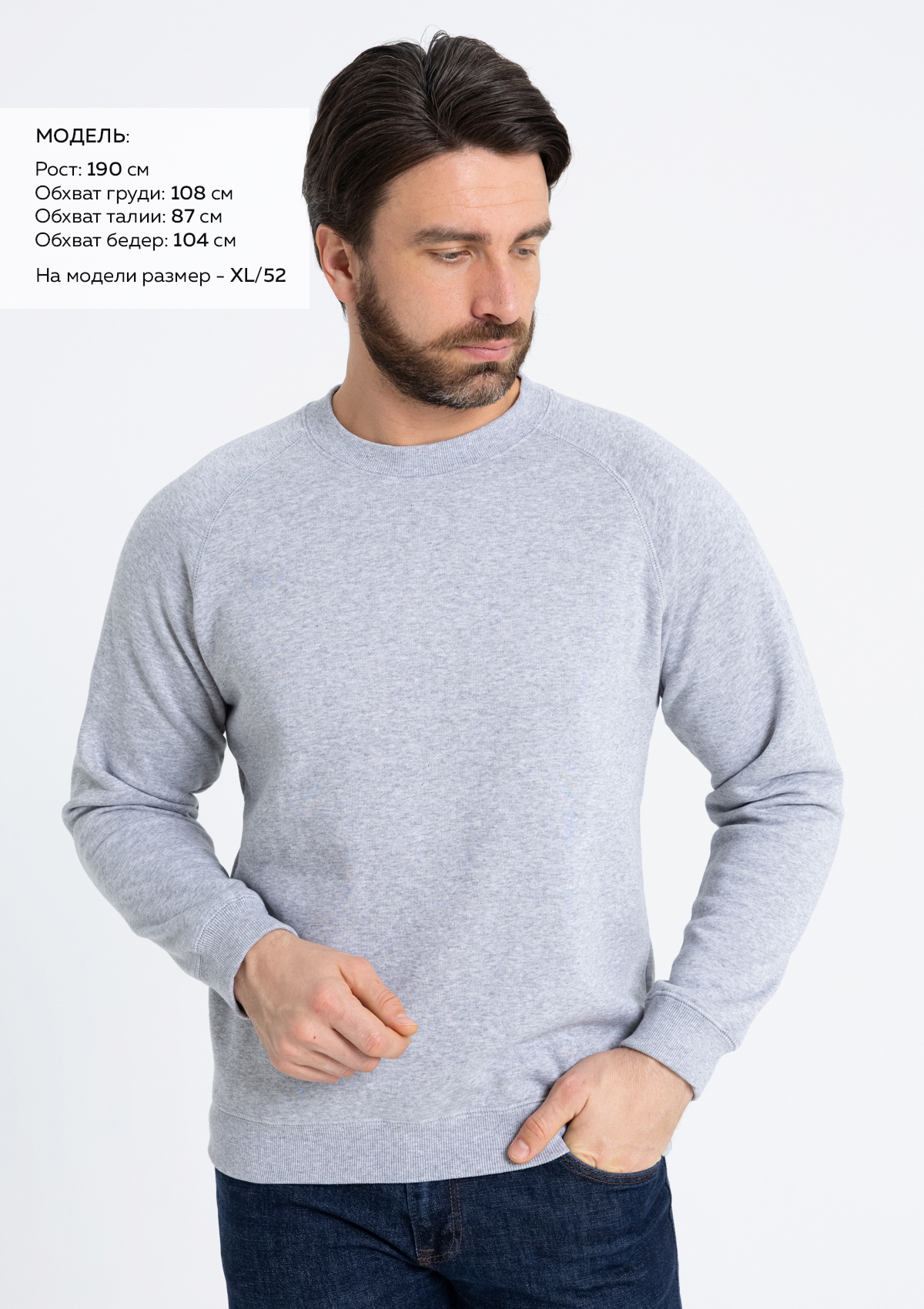 Размер мужской толстовки: XL/52. Параметры модели: рост 190 см.; обхват груди 108 см.; обхват талии 87 см.; обхват бедер 104 см
