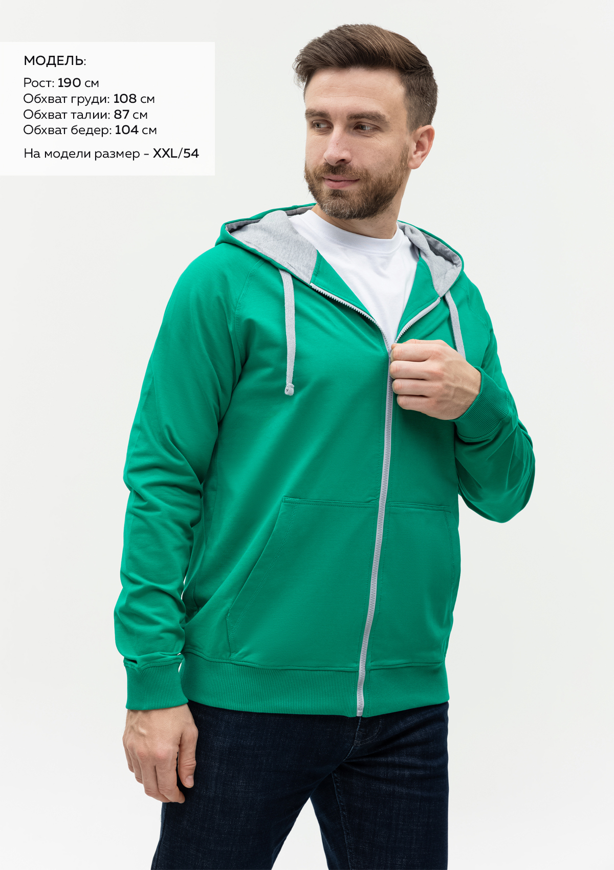 Размер мужской толстовки: XXL/54. Параметры модели: рост 190 см.; обхват груди 108 см.; обхват талии 87 см.; обхват бедер 104 см.