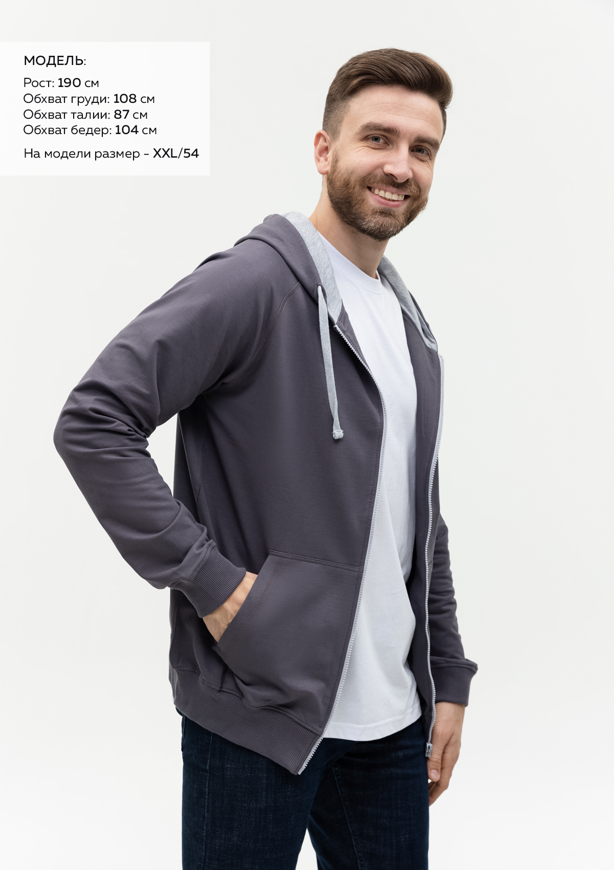 Размер мужской толстовки: XXL/54. Параметры модели: рост 190 см.; обхват груди 108 см.; обхват талии 87 см.; обхват бедер 104 см