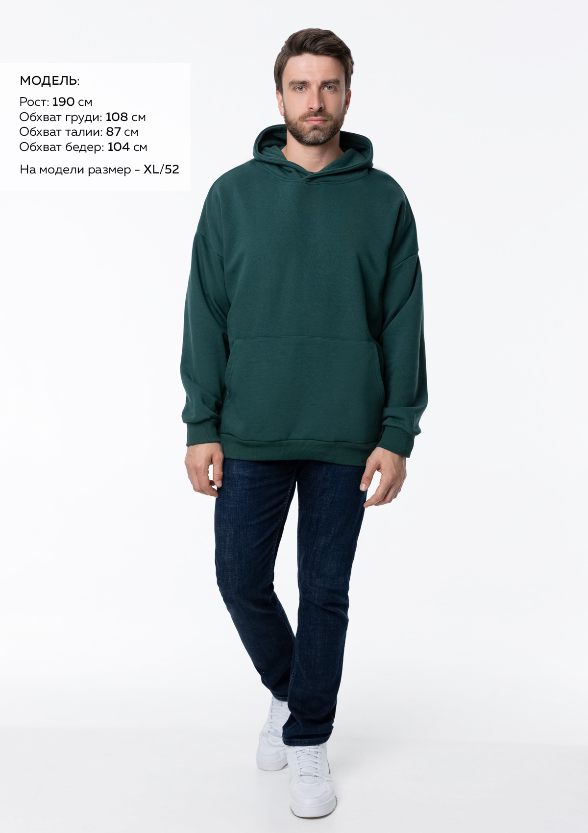 Размер мужского худи: XL/52. Параметры модели: рост 190 см.; обхват груди 108 см.; обхват талии 87 см.; обхват бедер 104 см.