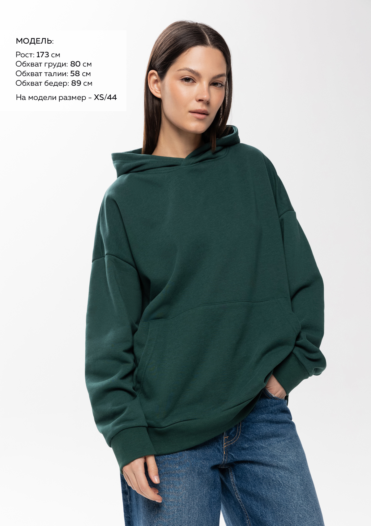 Размер женского худи: XS/44. Параметры модели: рост 173 см.; обхват груди 80 см.; обхват талии 58 см.; обхват бедер 89 см.