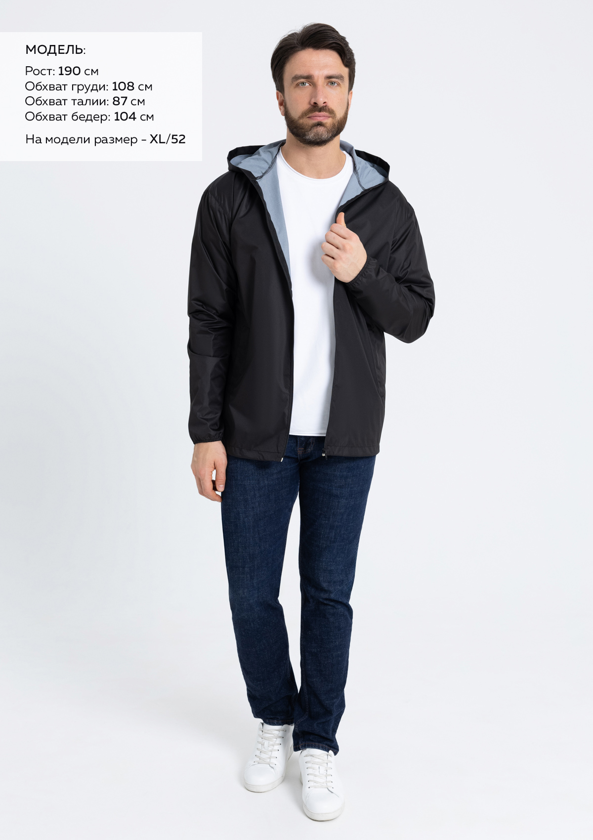 Размер на модели: XL/52. Параметры модели: рост 190 см.; обхват груди 108 см.; обхват талии 87 см.; обхват бедер 104 см.
