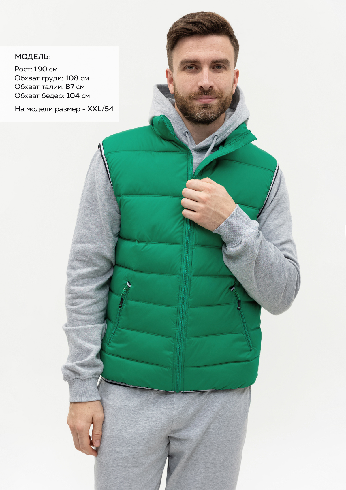 Размер на модели: XXL/54. Параметры модели: рост 190 см.; обхват груди 108 см.; обхват талии 87 см.; обхват бедер 104 см..