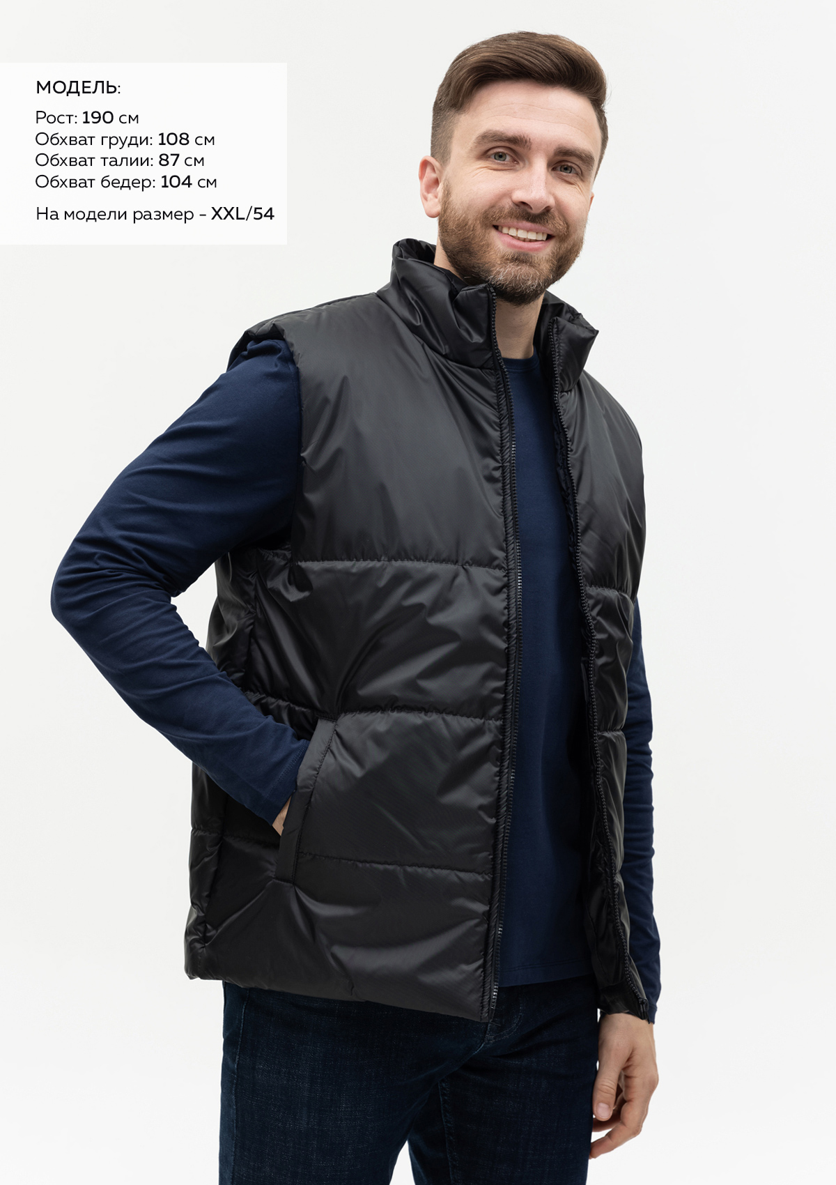 Размер мужского жилета: XXXL/56. Параметры модели: рост 190 см.; обхват груди 108 см.; обхват талии 87 см.; обхват бедер 104 см.