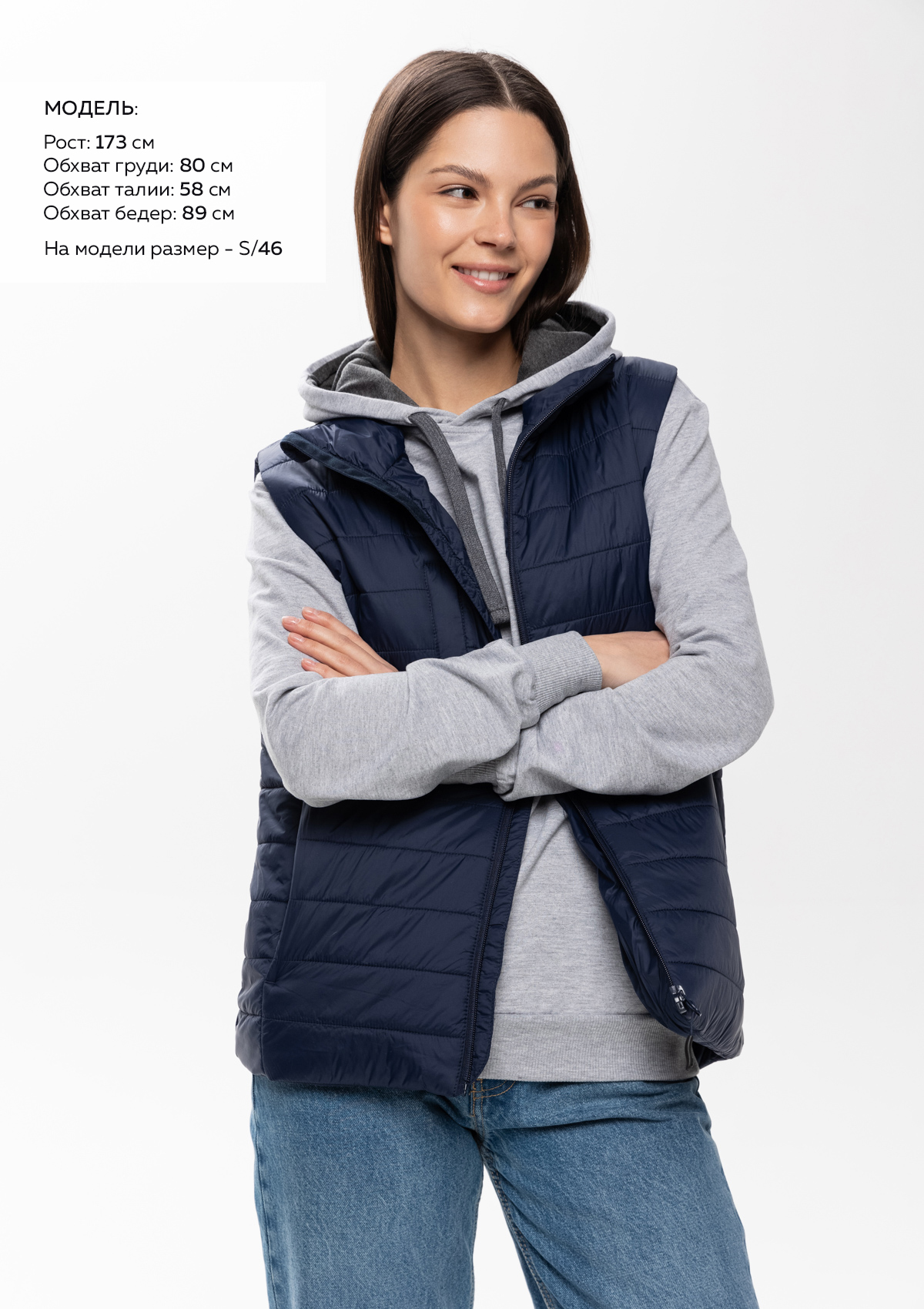 Размер на модели: S/46. Параметры модели: рост 173 см.; обхват груди 80 см.; обхват талии 58 см.; обхват бедер 89 см.
