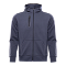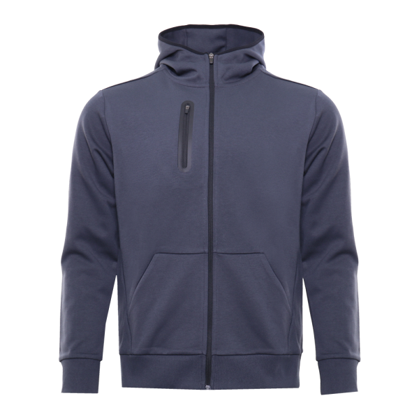 Толстовка прямого силуэта с капюшоном, переходящим в воротник-стойку, глубокими накладными карманами, прорезным нагрудным карманом и застежкой на молнию. Модель дополнена плотными манжетами на рукавах и по низу изделия, что повышает её практичность и защищает от проникновения холода.
